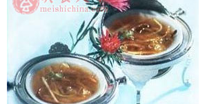 6、锅内原汁用水豆粉勾成二流浓汁,加少许鸡油、味精,起锅浇于鱼翅上即成。