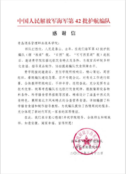 近日,海军第42批护航编队向烹饪学院发来感谢信,对我院依据远航饮食特点及条件,研制多样化食谱,指导菜品制作,协助提高编队饮食保障水平表示感谢。