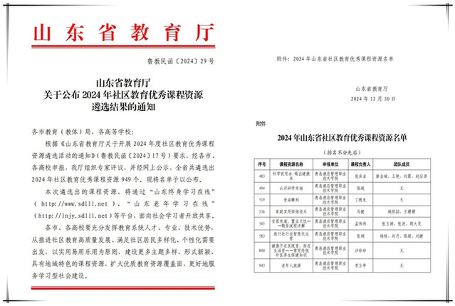 近日,山东省教育厅公布了2024年社区教育优秀课程资源遴选结果,烹饪学院2门课程入选。