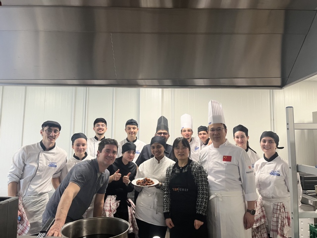 交流期间,李军老师通过理论讲座、实训演示和菜品品鉴等多种形式,举办“中法厨艺与饮食文化交流”活动,与佩里格烹饪高等学校师生及当地餐饮界人士进行了深入交流。在实训操作环节,李军老师现场示范了经典中式菜肴的制作,精湛的刀工、对火候的精准把握,以及将寻常食材转化为色香味形俱佳艺术品的技艺,引发了在场师生的浓厚兴趣。两校教师还围绕专业课程设置、饮食文化交流、技能融合创新等内容进行研讨。
