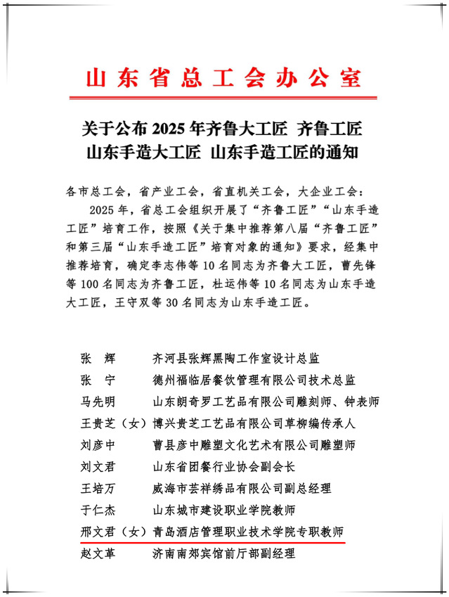 本网讯(工会 吴春雷)近日,山东省总工会下发《关于公布2025年齐鲁大工匠 齐鲁工匠 山东手造大工匠 山东手造工匠的通知》,学校烹饪学院教师邢文君喜获“山东手造工匠”荣誉称号。