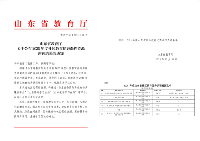 本网讯(继续教育学院)近日,山东省教育厅公布了2025年度山东省继续教育数字化共享课程和社区教育优秀课程资源遴选结果,我校7门课程入选。