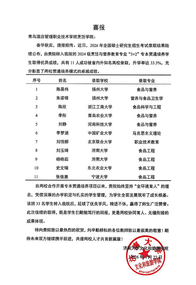 本网讯(烹饪学院 吴琼)2026年全国硕士研究生招生复试录取结果陆续揭晓,学校与济南大学联合培养的2021级烹饪工艺与营养专本贯通班捷报频传,共有11名学生成功“上岸”,升学率达33.3%,充分彰显了两校专本贯通合作培养模式的显著育人优势。